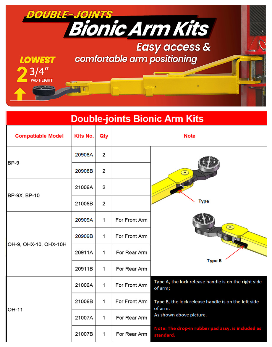 The new optional kits for the AMGO two-post lift enhance its features by offering a minimum pad height of 2 3/4″ and facilitating easy arm access and positioning for various vehicles, including electric and low-clearance models.