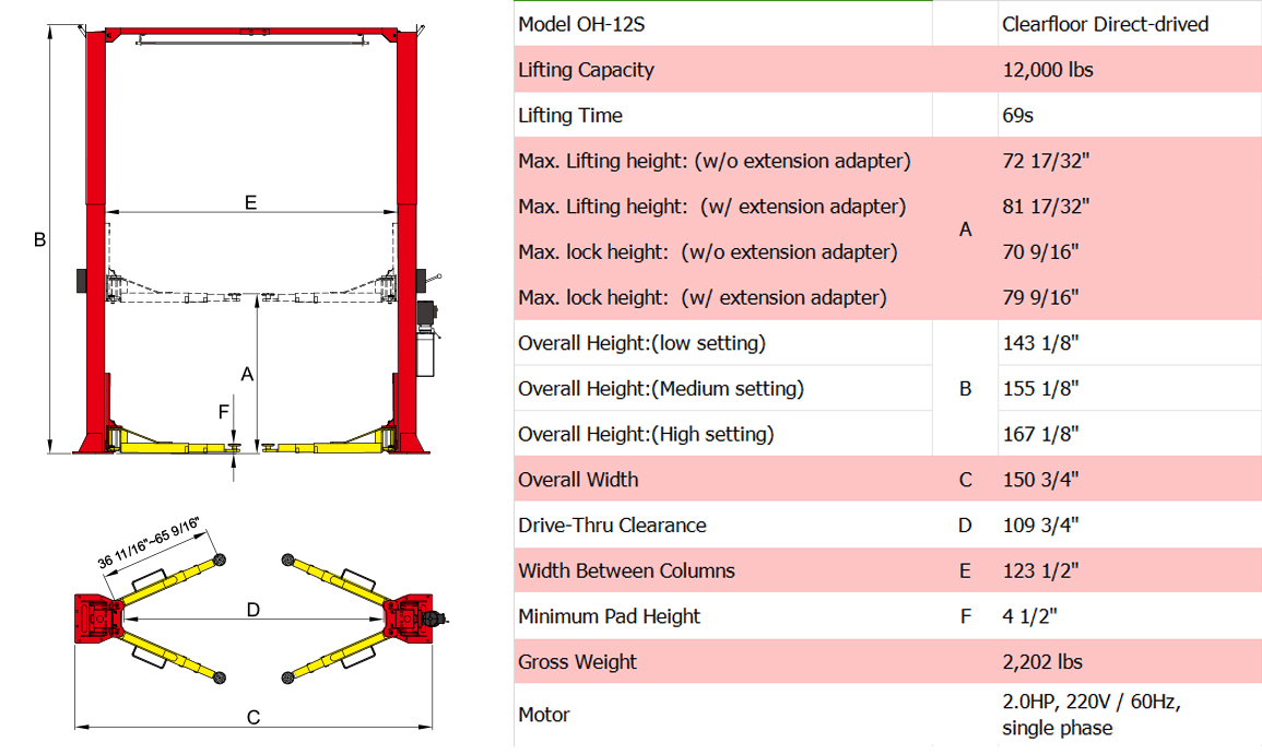 Our newest Heavy Duty two post lift: OH-12S is the ideal choice for shops and service centers with limited ceiling height.