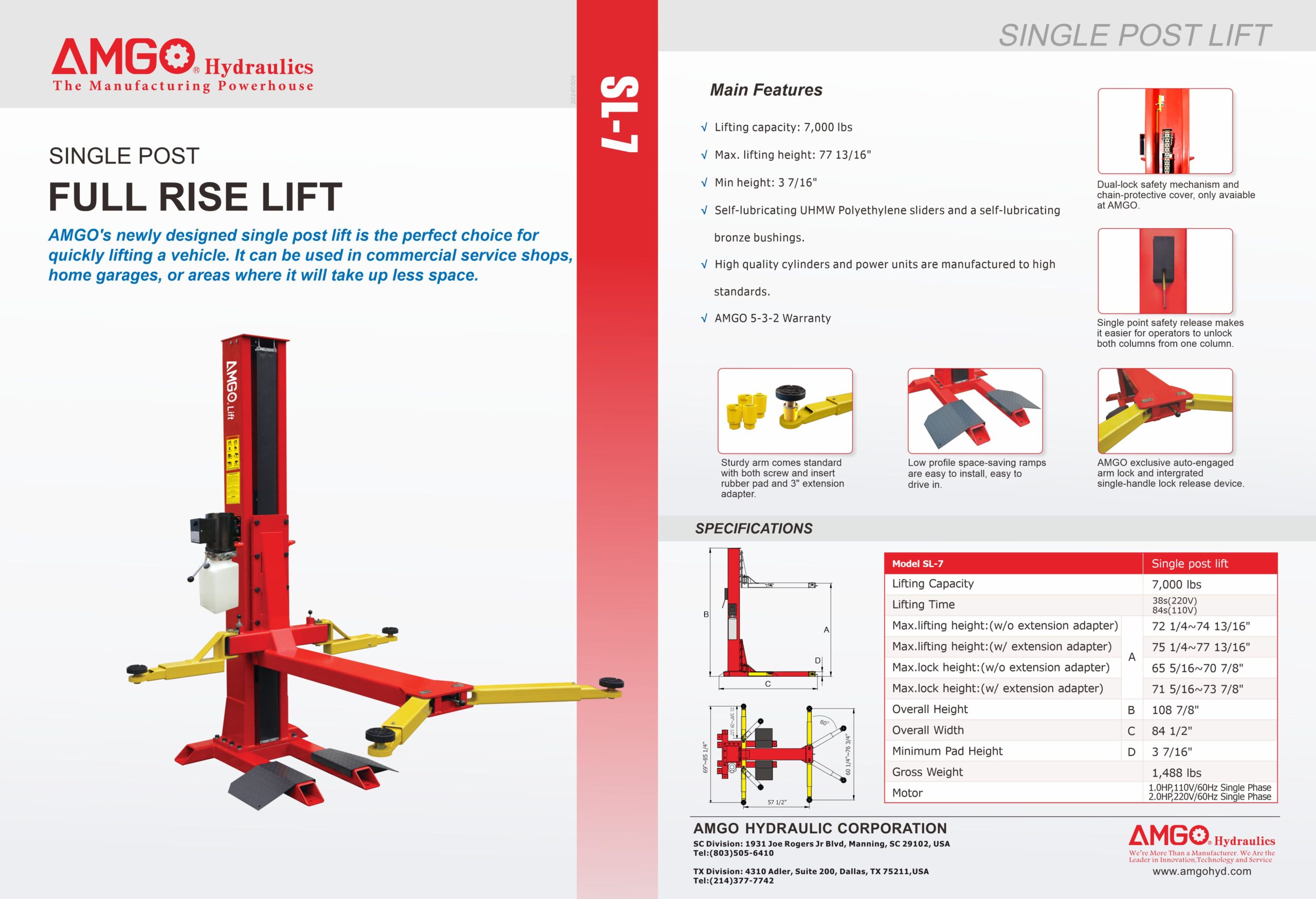 AMGO’s newly designed single post lift is the perfect choice when you must quickly lift a vehicle in limited space.The SL-7 is one of the least space-consuming, permanently affixed lifts in the world and can be used in commercial service shops, home garages, or any area where space is at a premium and durability is a must