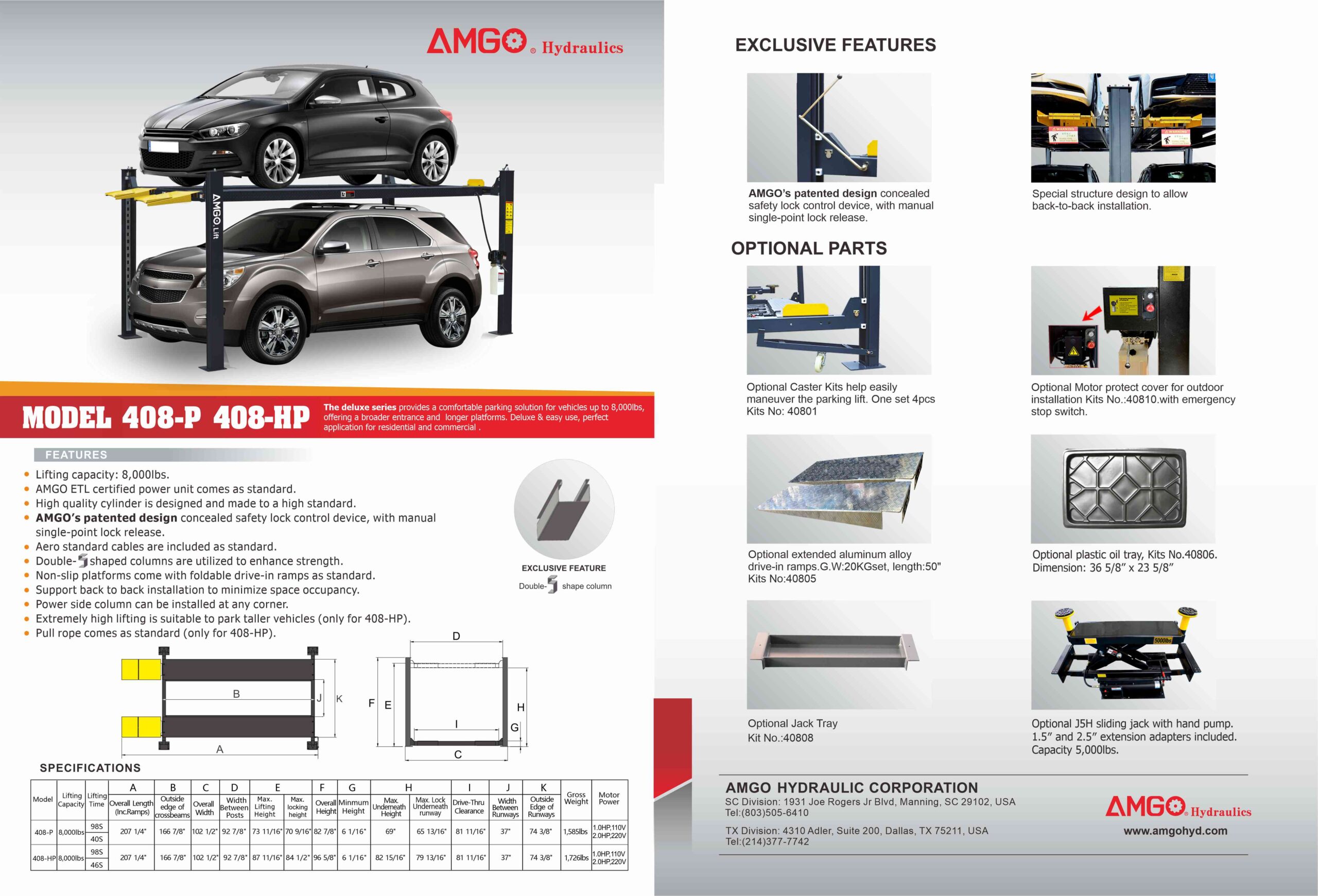 • AMGO exclusive hidden safety locks and manual single-point release device allows for operators to unlock the safety locks from one column simultaneous.