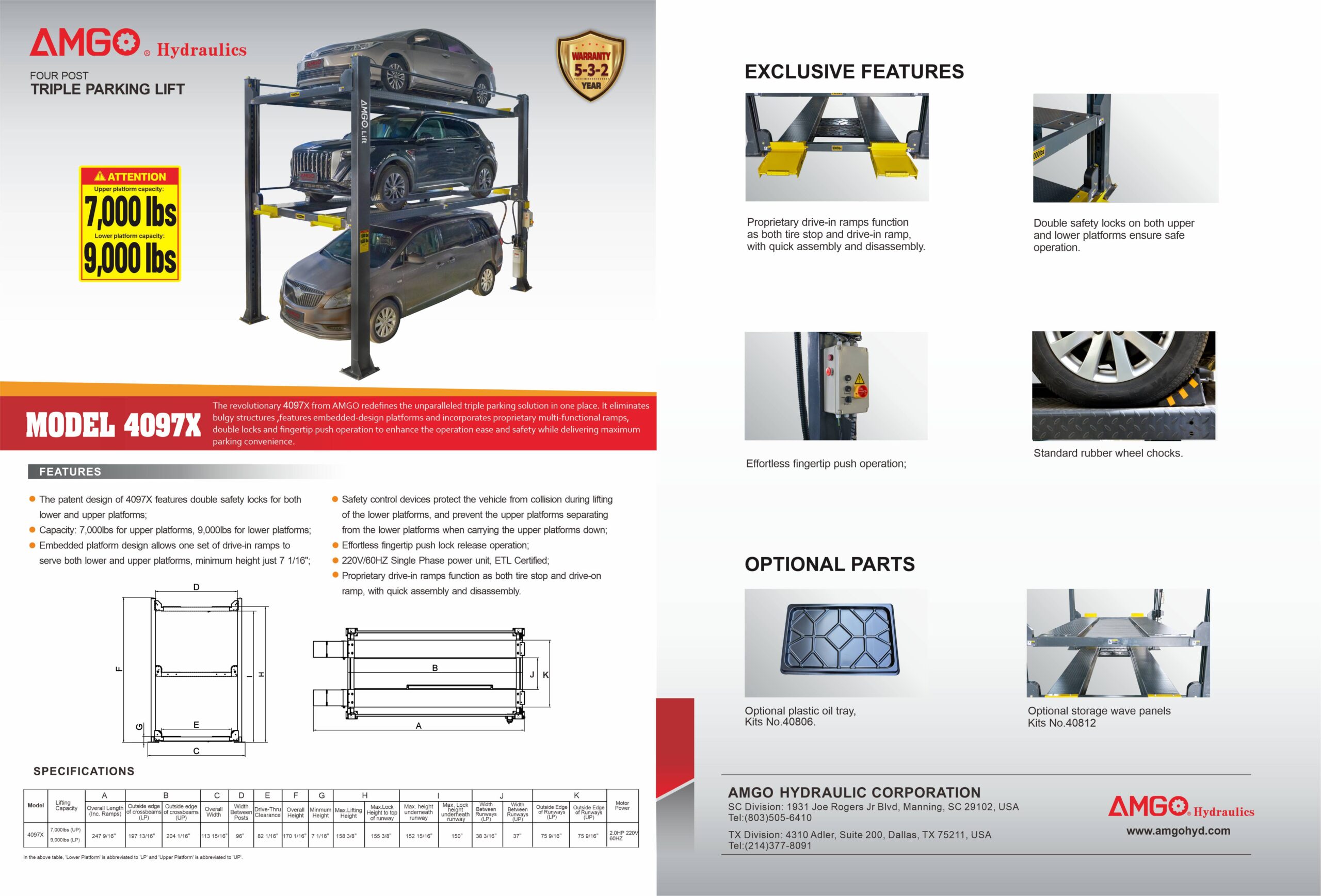 The revolutionary 4097X from AMGO redefines the unparalleled triple parking solution in one place. It eliminates bulgy structures ,features embedded-design platforms and incorporates proprietary multi-functional ramps, double locks and fingertip push operation to enhance the operation ease and safety while delivering maximum parking convenience.