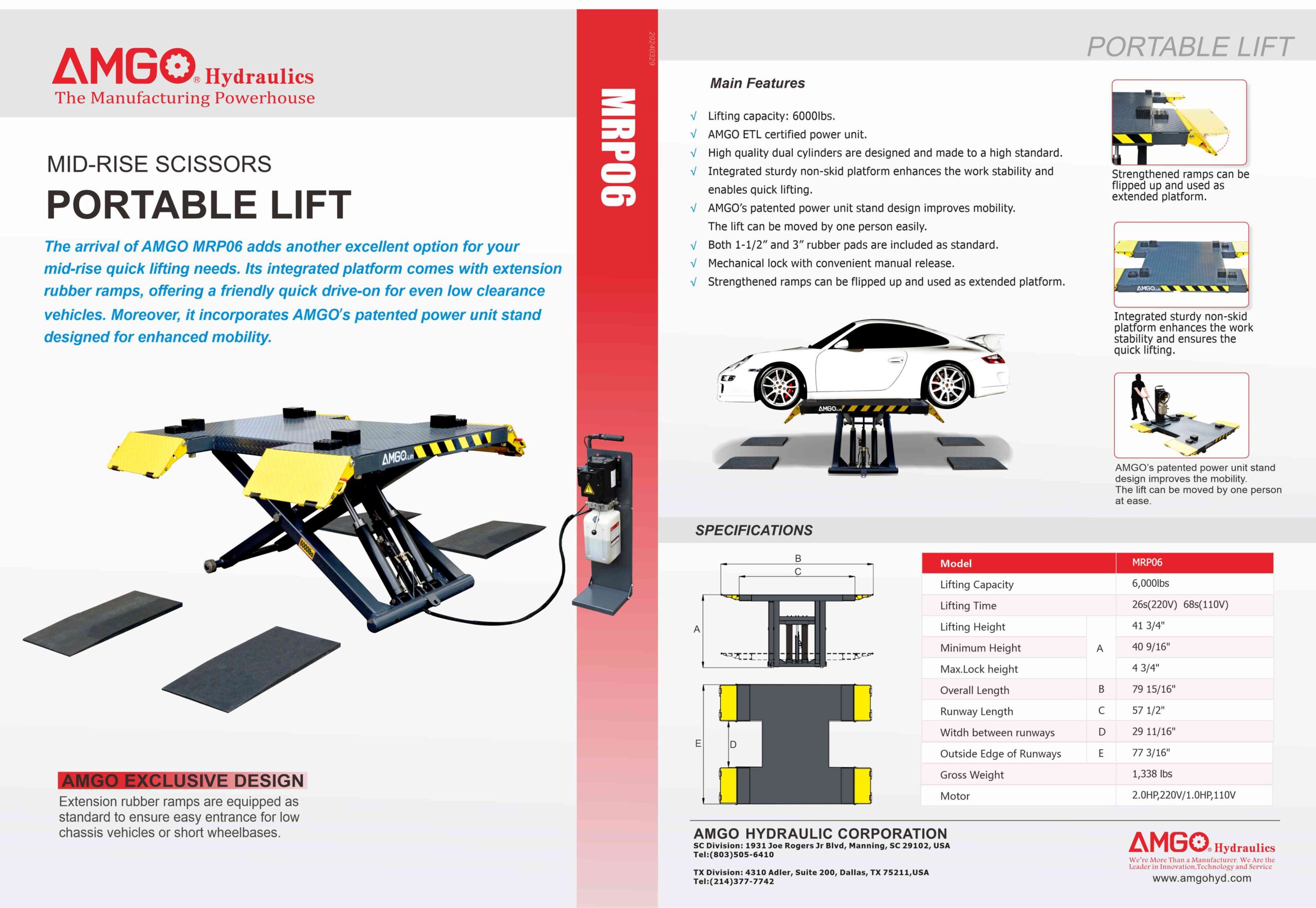 The arrival of AMGO MRP06 adds another excellent option for your mid-rise quick lifting needs. Its integrated platform comes with extension rubber ramps, offering a friendly quick drive-on for even low clearance vehicles. Moreover, it incorporates AMGO’s new power unit stand designed for enhanced mobility.
