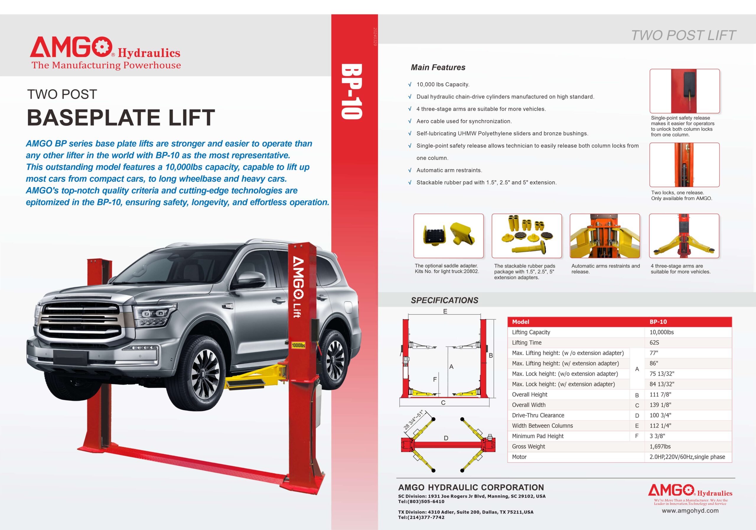 AMGO BP Series Base plate two post lifts are stronger and more convenient to operate than most all other lifts in the world. The rugged BP-10 can lift vehicles up to 10,000 lbs. It is designed with no overhead obstructions for low ceiling professional and home garages to increase headroom. AMGO two post lifts are manufactured according to high-quality standards, while using critical materials and parts choosing, with advanced features and innovative technology.