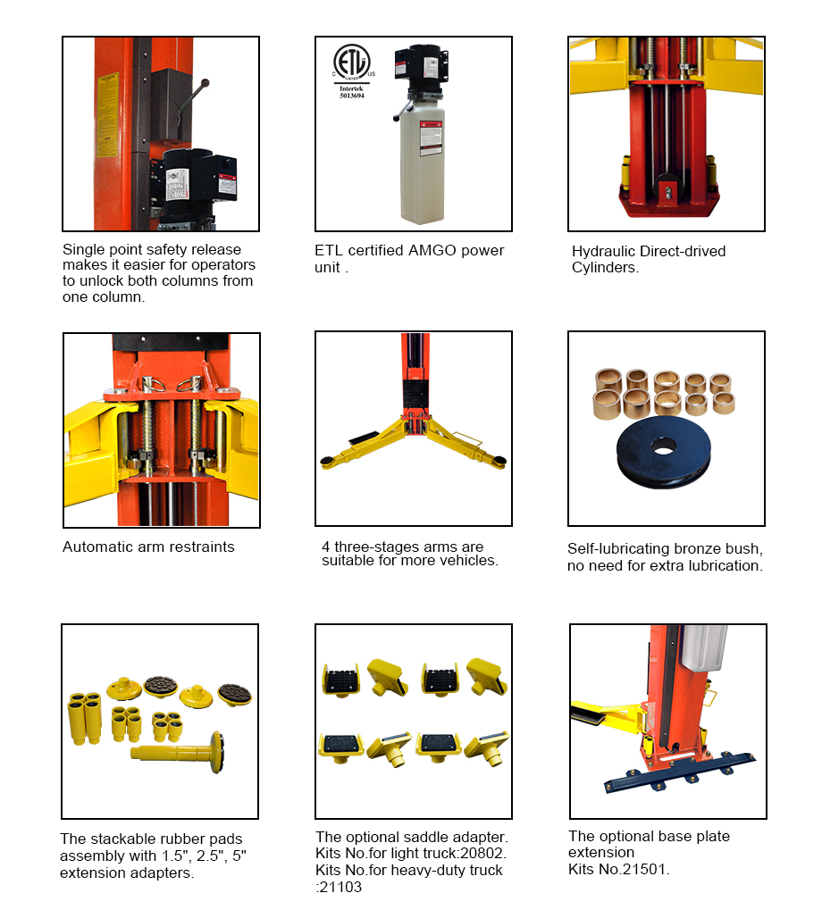 AMGO Hydraulic Corporation offers one of the best warranties in the business with warranties as follows: 1.Steel Structure Components (including columns, carriages, lifting arms, top beam, floor cover, platform, cross beam, car drive-in ramp, scissor, base plate, etc.) Warranty for Five(5) Years. 2.Hydraulic Parts (including cylinders, oil seal, oil hose, fitting etc.) Warranty for Three(3) Years. 3.Other Parts(not including consumption parts such as rubber pads), electrical components, power unit have Warranty for Two(2) Years. Warranty coverage would be applicable to the 48 contiguous states. If outside the 48 contiguous states, please call AMGO Hydraulic Corporation. If warranty parts are needed, AMGO Hydraulic Corporation will send them out at our own cost at standard ground shipping rate. If customer needs parts more quickly, it will be the customer's responsibility to pay for expedited shipping charges. AMGO Hydraulic Corporation will not compensate customers for down time when their equipment is out of service. AMGO Hydraulic Corporation will not compensate customers for time lost if freight is not delivered on the date or time estimated by the freight company.