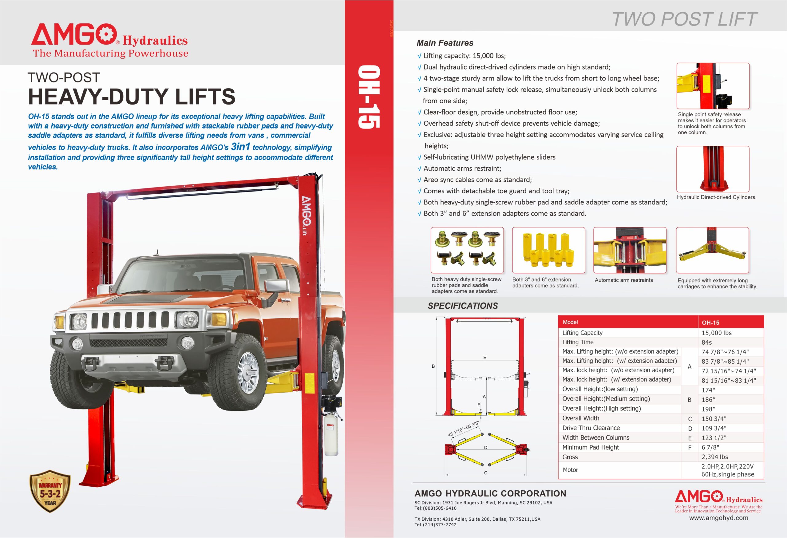 OH-15 two post lift are the new products developed by AMGO for heavy duty purpose with a lifting capacity up to 15000lbs. Heavy-duty construction,self-lubricating bush,sliders and high quality parts to make the lift almost no maintenance required.