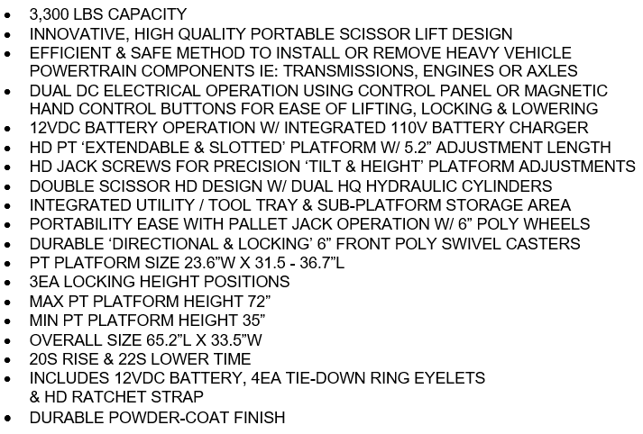 The iDEAL LT-PT3300DC-X is a 3,300 lb. portable, high-rise commercial / industrial grade 12VDC battery powered electric-hydraulic lift table, incorporating a multi-adjustable powertrain platform primarily designed to assist with controlled lifting & lowering tasks to safely remove, replace or service heavy vehicle powertrain components such as engines, transmissions, drive-axle & transaxle assemblies, or other similar heavy components. The LT-PT3300DC-X comes standardly equipped with a durable powertrain platform that includes extendable length, tilt & height adjustments, while also incorporating a fully operational remote hand controller & control box panel buttons for dual operational control operations. Also included is a high quality deep-cycle 12VDC sealed battery, integrated battery charger and 12VDC auxiliary outlet port. In addition, the iDEAL Powertrain 3300 lb. lift table comes standard with a pallet jack dolly with poly casters, leg support stands, front locking swivel & directional poly casters, tool tray, double lift scissors, powerful DC electric motor, dual hydraulic cylinders, tie-down anchors, and heavy duty ratchet strap. Optional Accessories include a ‘quick mount’ PT Support Stand Kit & 12VDC LED Spot Light with magnetic base.