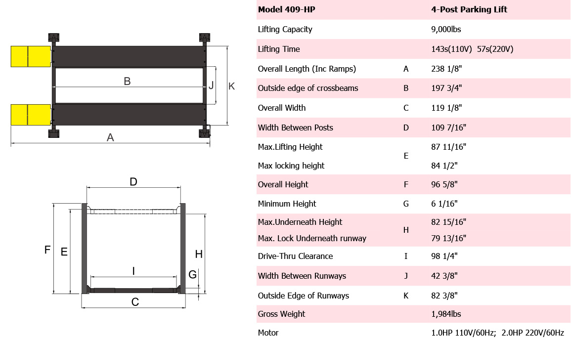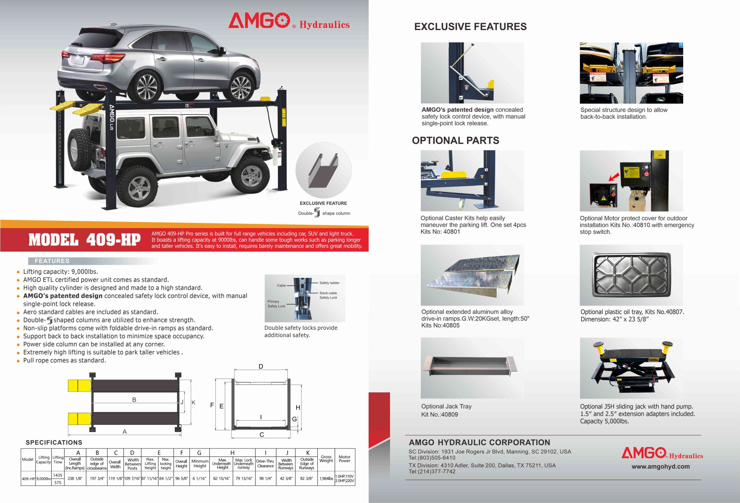 AMGO’s 409-HP Commercial Grade 4-post Parking Lift for cars, vans and light trucks is similar to AMGO models 408-P and 409-P. It is longer than the 409-P, wider than the 408-P, faster than the 408-P, and more powerful than the 408-P. The 409-HP is the perfect choice for commercial garages trying to save space and maximize performance. The 409-HP requires no special foundation or complicated installation and is about the size of a typical parking space. These features, and more, make the AMGO 409-HP one of the best commercial use lifts in the world.