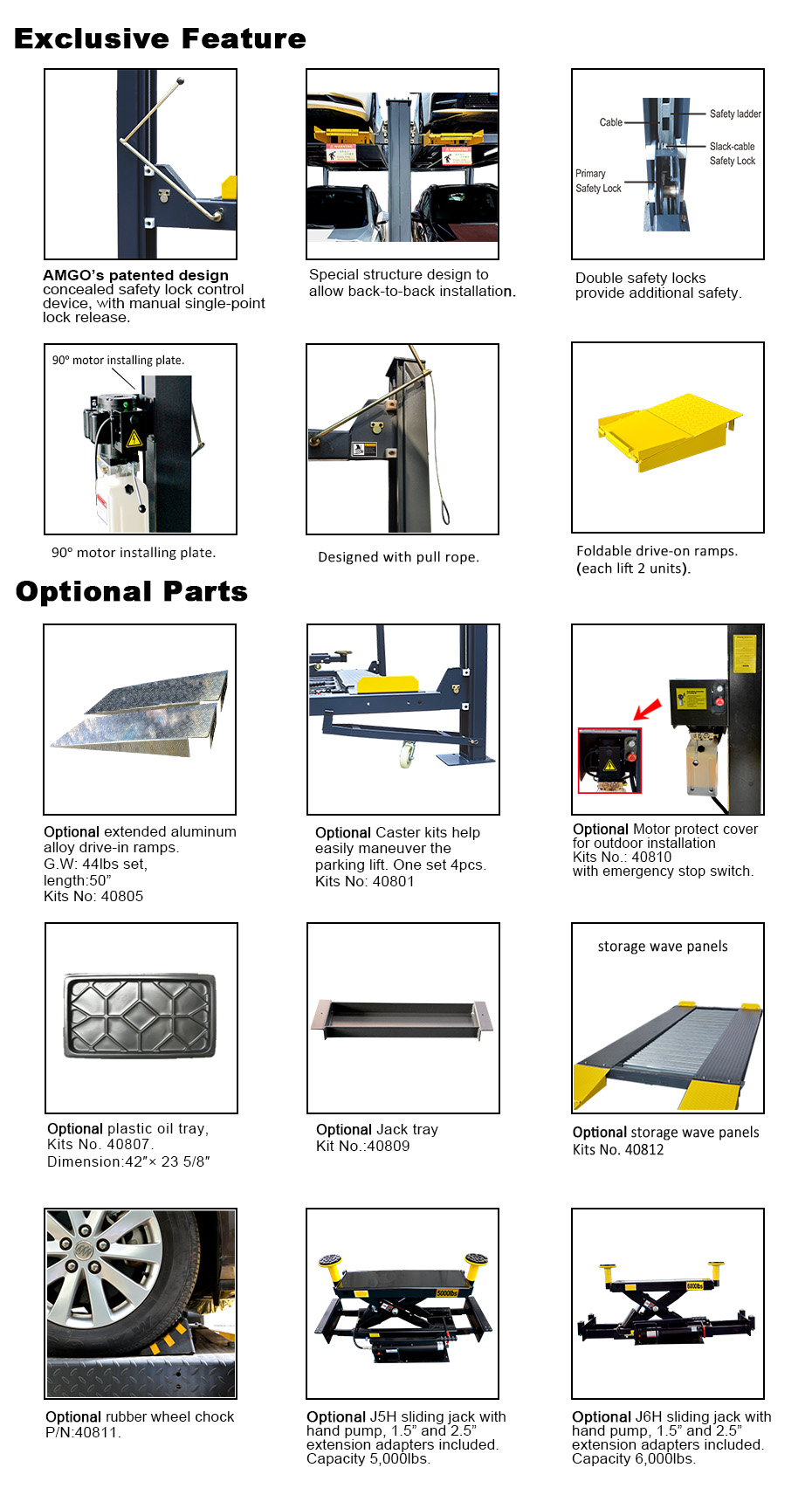 - AMGO exclusive hidden safety locks and manual single-point release device allows for operators to unlock the safety locks from one column simultaneously.